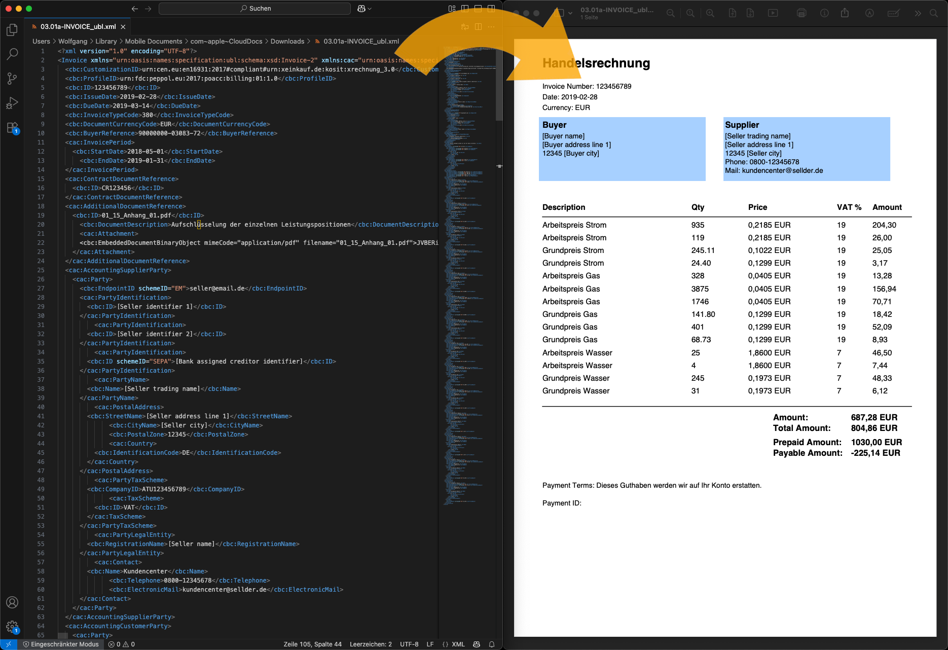 In the EU, companies that send invoices to public administrations must do so in electronic form. These are pure XML files (called XRechnung in Germany). To make them easy to read, I have created a class that reads the XML and outputs a PDF file.