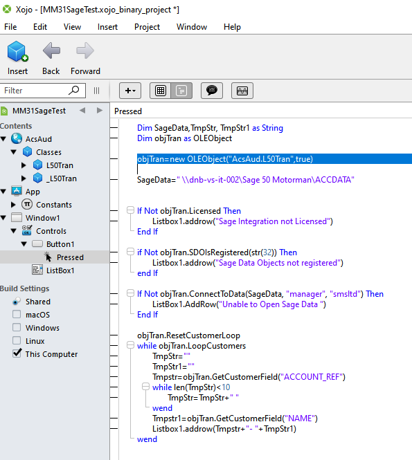 Trying to include a tool which links to Sage Accounts imported from RealBasic
