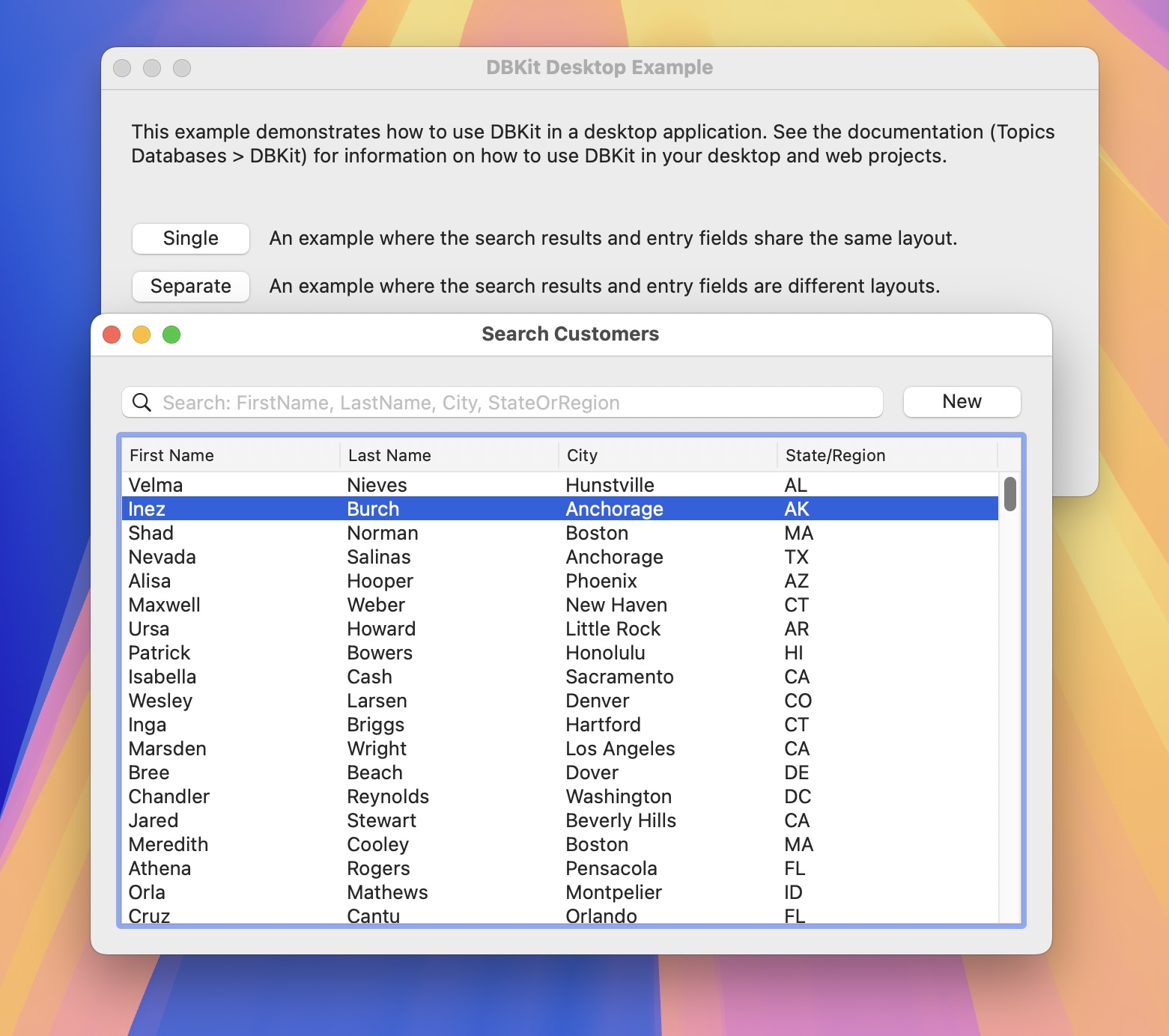 I am developing a small quotation database whose main window resembles the « Search Customers » example from « DBKit Desktop Example » (the one you get after clicking on the “separate” button, where the search results and data entry fields are on two different windows). So I have one window with one large list box with many columns.