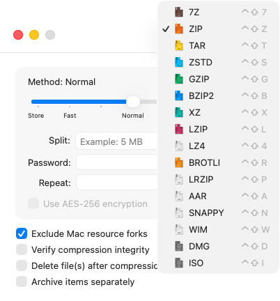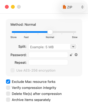 It’s great that Jeff has a solution that he’s happy with. For others looking for a more robust zipping solution on the Mac, I second Tim and others’ endorsement of Keka. It’s got just about everything one could want in a simple and inexpensive package. Here’s a screen shot of the settings screen: