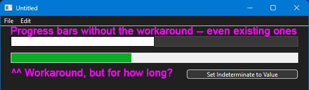 I will throw this in, without meaning to hijack the thread, but I am having success in migrating the Windows versions of my projects to the “experimental” WinUI. To this end I have been actively testing, and have submitted numerous tickets. The progress bar looks quite nice there, as does the overall look. For one of my projects, I just need one fix, https://tracker.xojo.com/xojoinc/xojo/-/issues/80649.