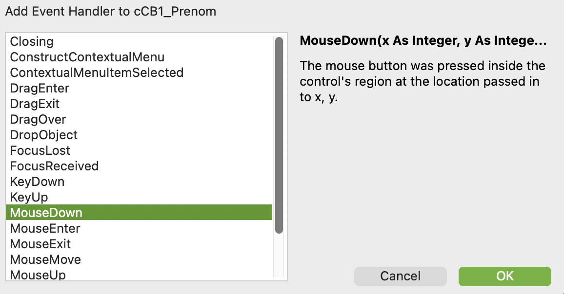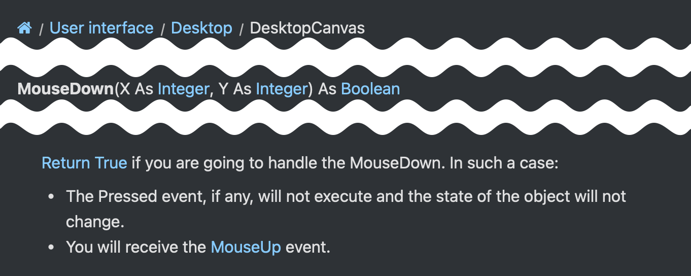 I have Xojo 2025r3.1 installed here and I see the following when I use the IDE Documentation button to search for DesktopCanvas MouseDown: