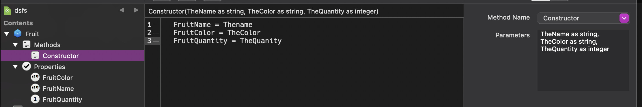 So if you have a Fruit class that has Color, Name, and Quantity as properties, you can create and populate an instance of that class thusly: