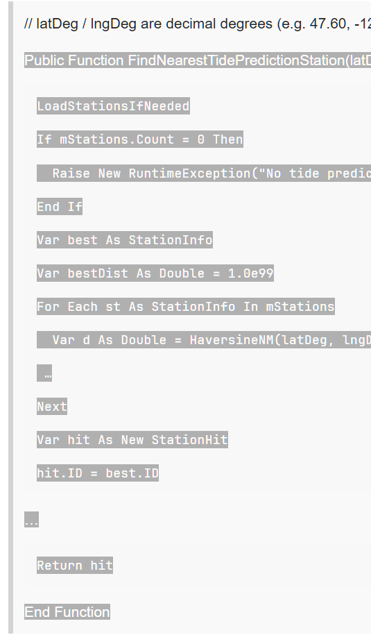 Public Function FindNearestTidePredictionStation(latDeg As Double, lngDeg As Double) As StationHit