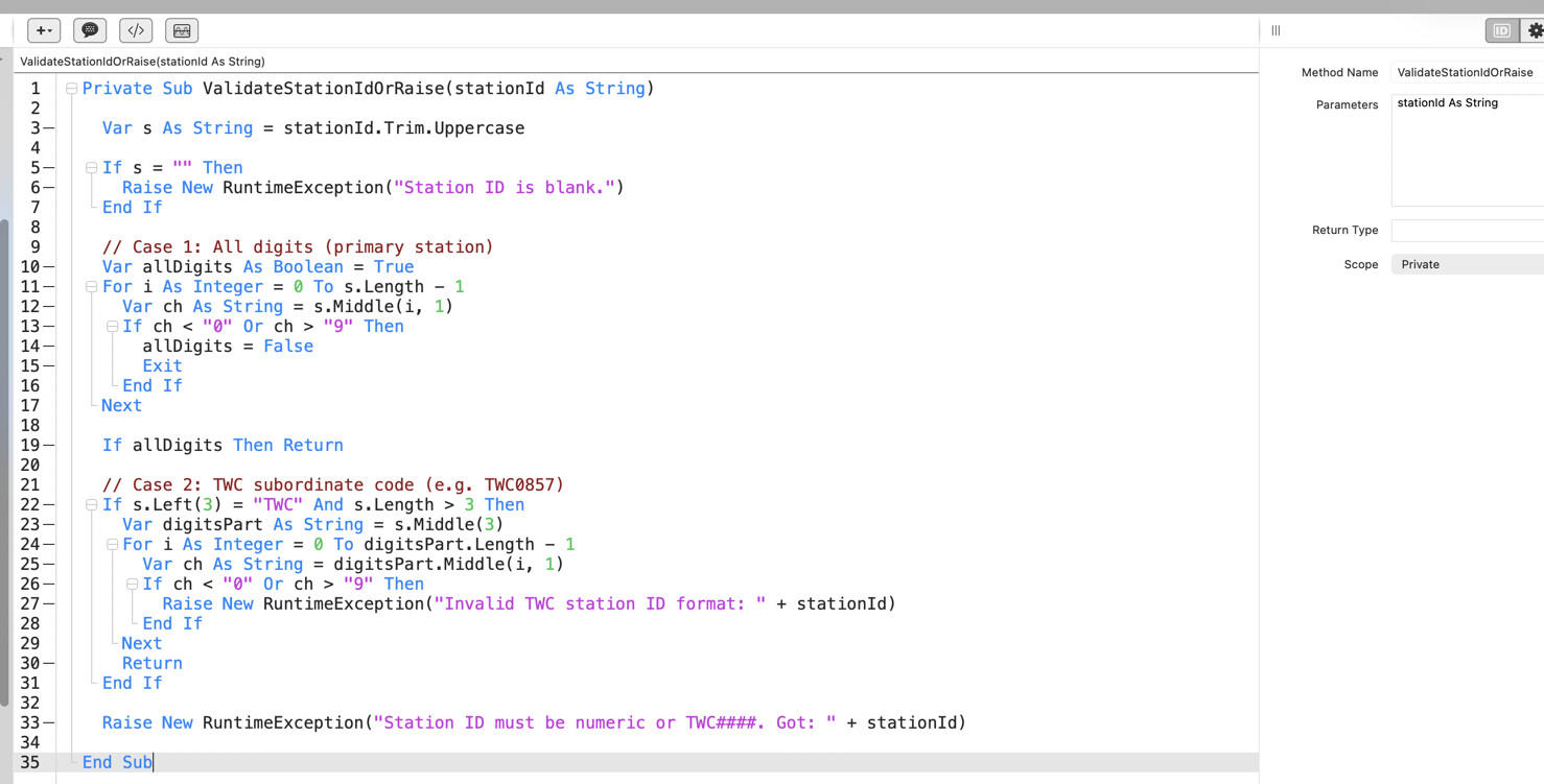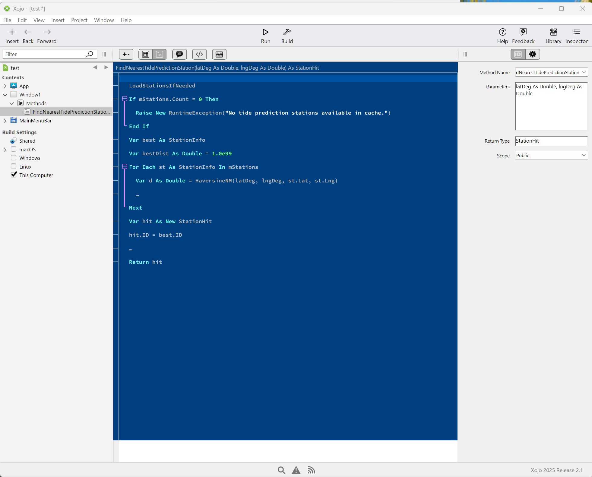 What I do is go to the IDE and insert a new (blank) Method in the appropriate place. Then I past all this text in. Then I go through the steps of taking the name (FindNearestTidePredictionStation) and pasting that in the correct location. I take the parameters (latDeg As Double, lngDeg As Double) and paste them. I take the Return value (StationHit) and paste that. Then I erase the lines: ( Public Function FindNearestTidePredictionStation(latDeg As Double, lngDeg As Double) As StationHit & End Function)