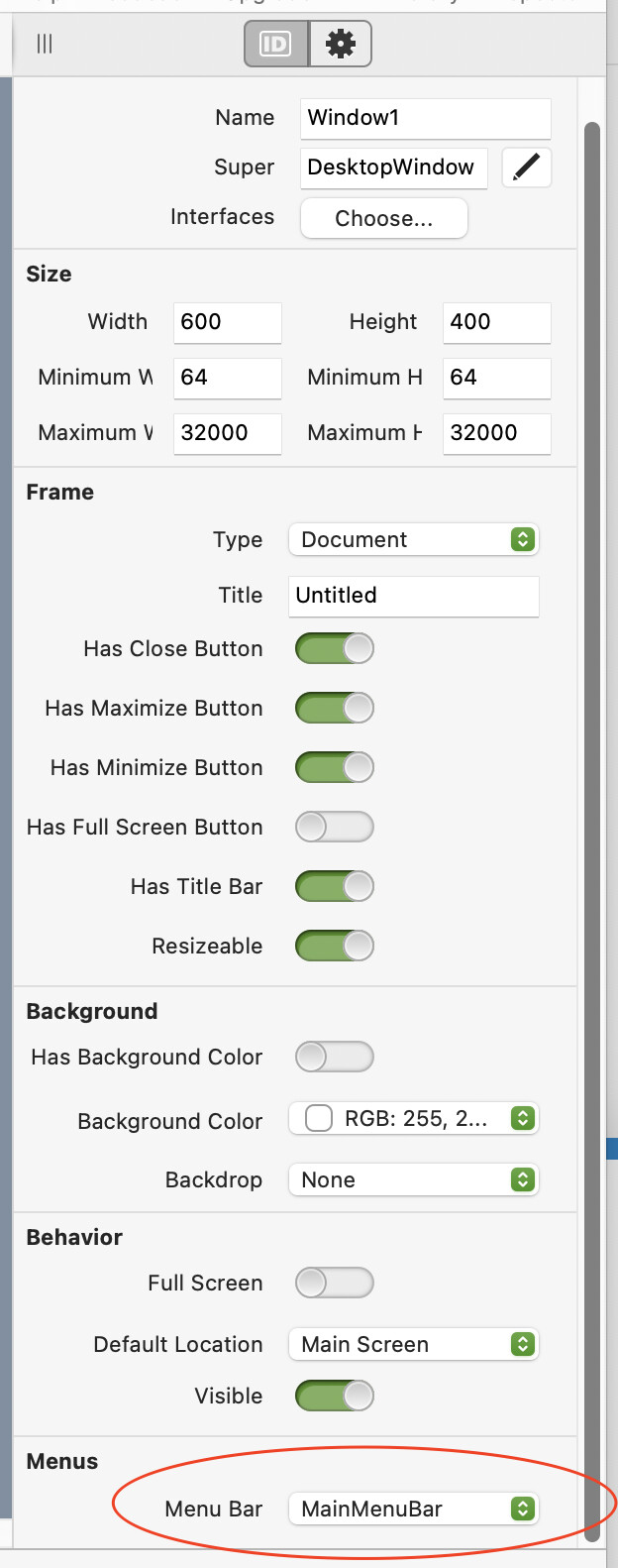 It is possible to assign a menubar to a window in the inspector, but it is also possible to do the same thing in code: