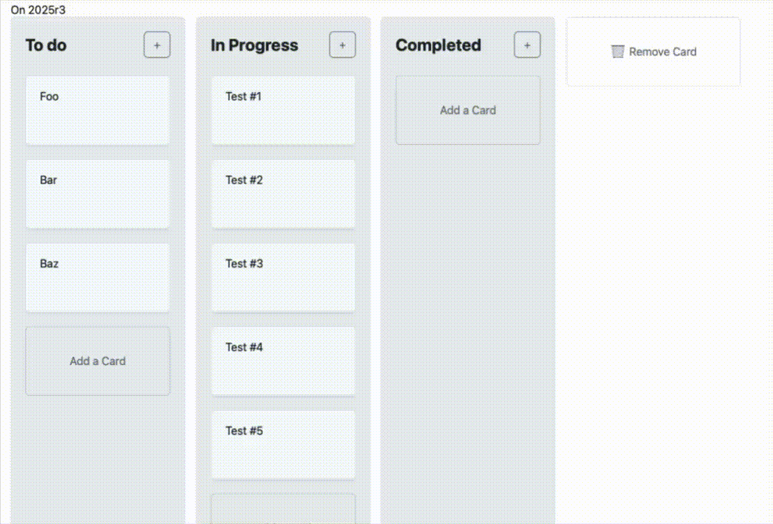 The example project for web kanban works perfectly on 2025r2.1 but does not on 2025r3 - means no drag&drop events seem to be raised at all. Objects cannot be moved, dragged, dropped.