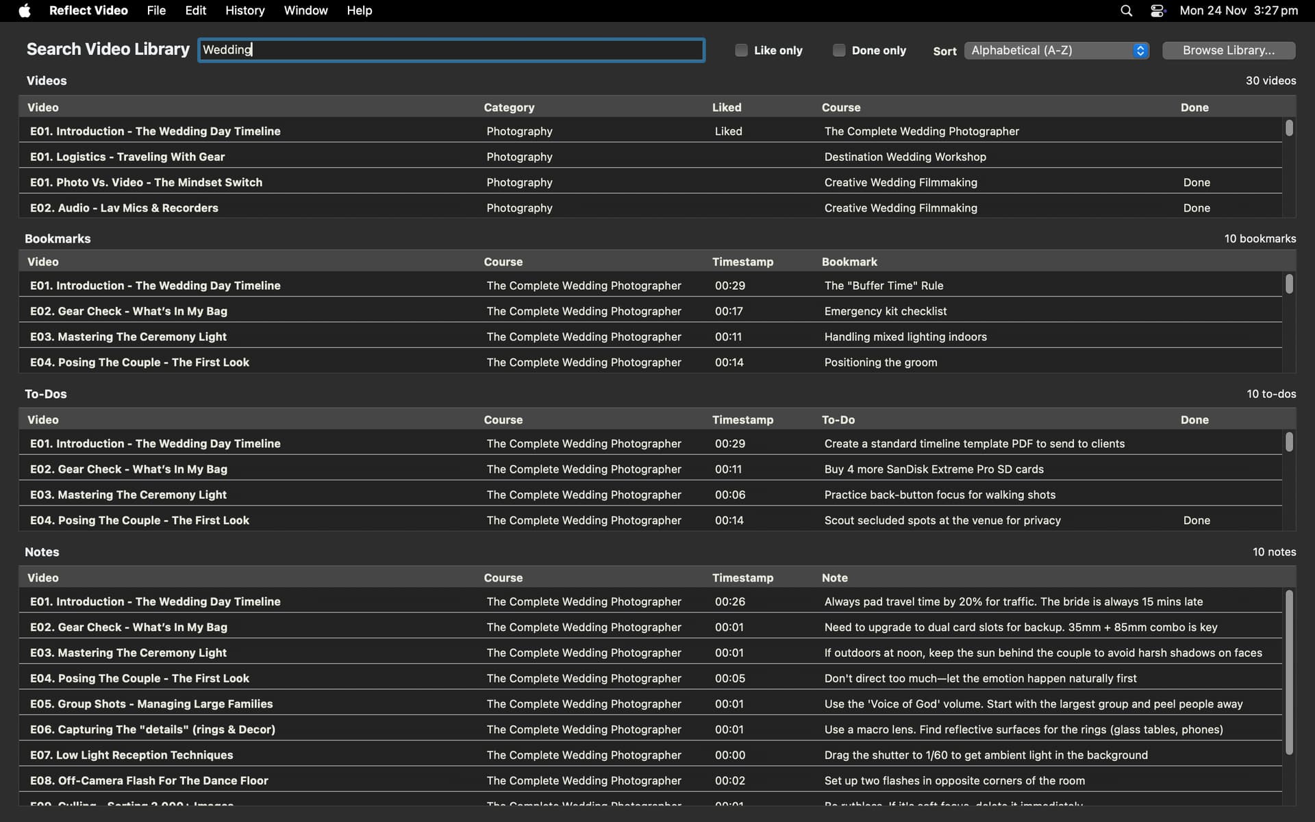 There’s a search window to search video titles, bookmarks, to-do tasks and notes. This includes, liked and done, and full sorting.