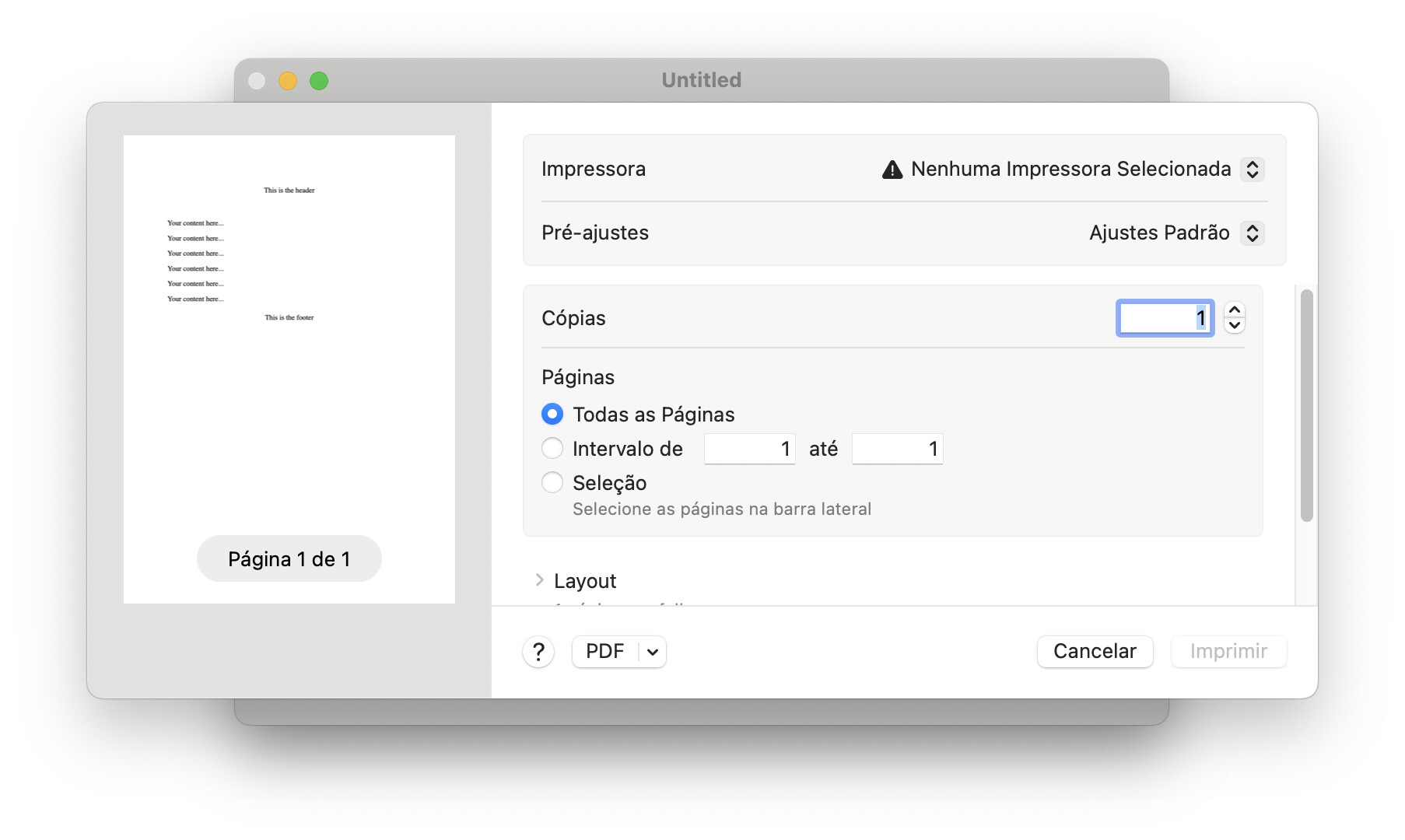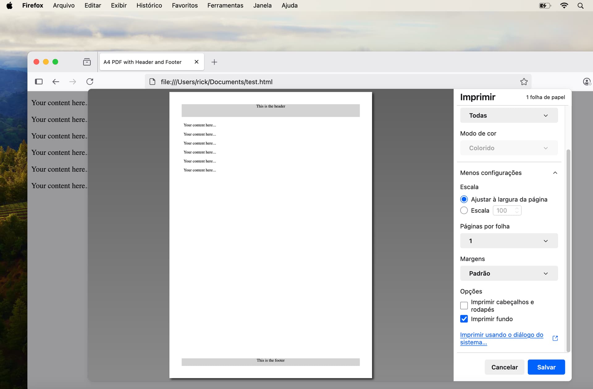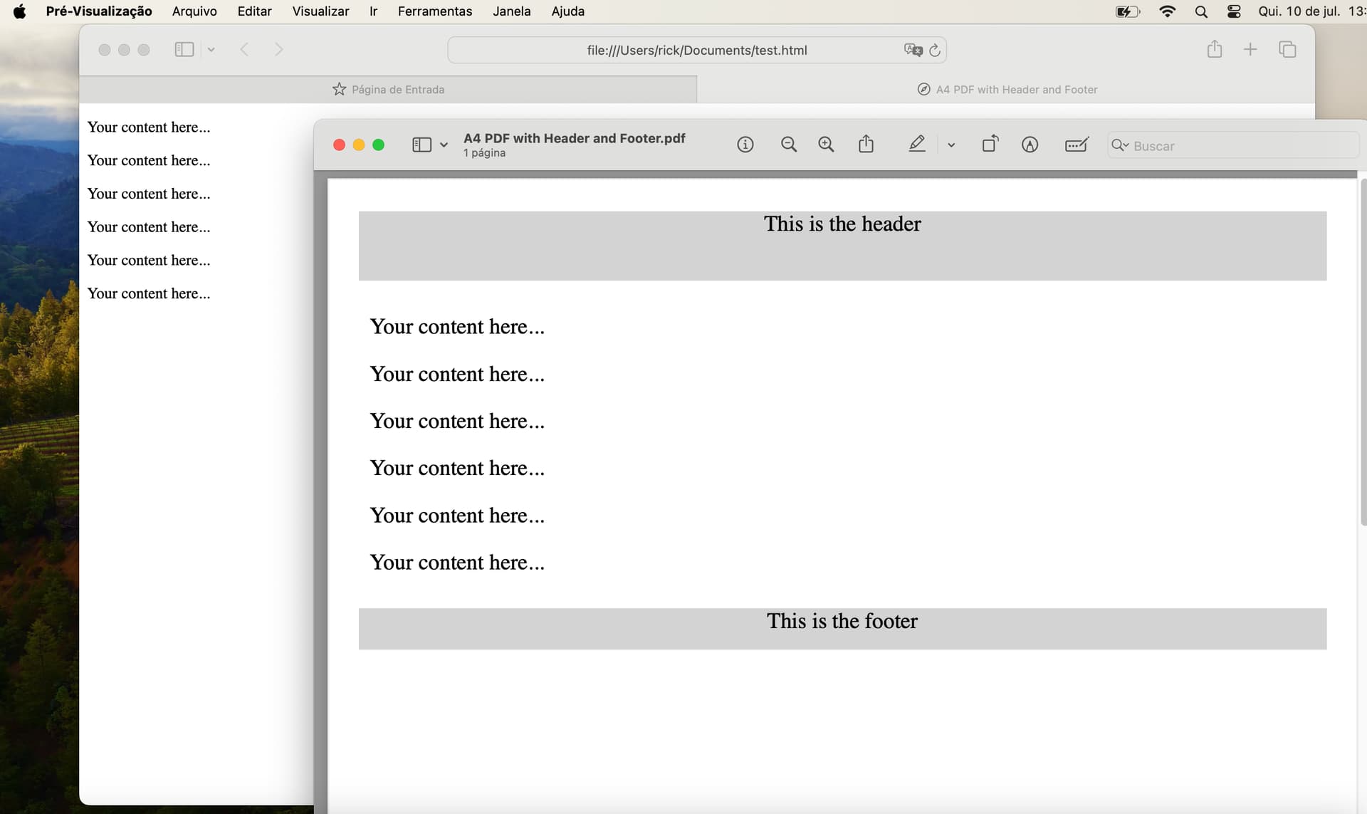 The Xojo people should know how to use declares on macOS. PDFs from html can be created with an NSPrintOperationMBS(Monkeybread Xojo plugin - NSPrintOperationMBS class ). The second part for header/footer uses CGPDFDocumentMBS (Monkeybread Xojo plugin - CGPDFDocumentMBS class ). You draw the first PDF inside of the final PDF and then add the header and footer.