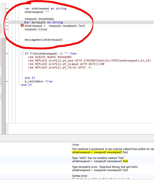Make sure you move the text out of UI controls on Form B into properties of Form B before Form B is closed. Once Form B is closed, you can’t access any of the controls (so for example accessing FormB.txtPassword.Text will raise a NilObjectException). That’s what the Example Project from above shows you in the AddAndClose function.