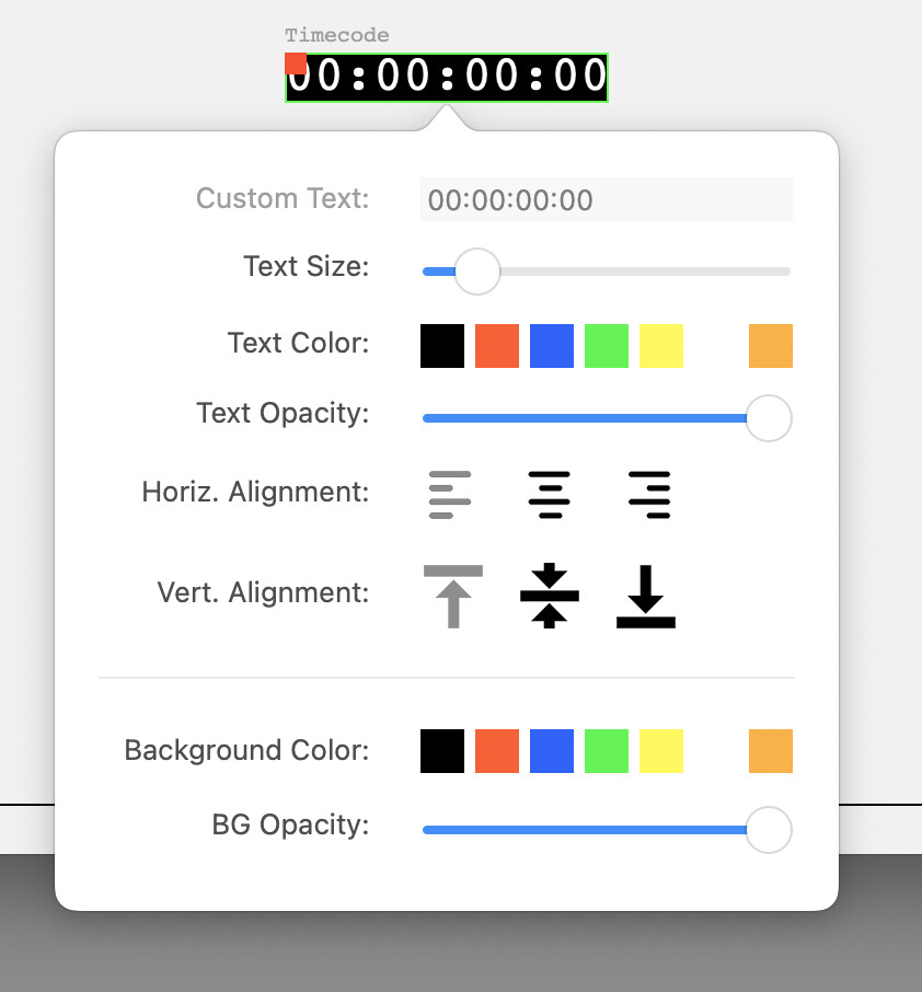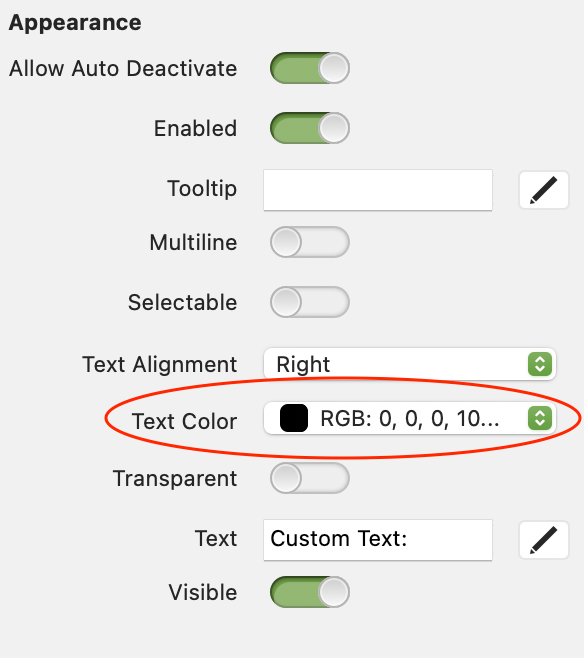 The sliders in here have no bearing on the issue at hand. They control the opacity of text and the background in the object on the canvas behind it, and have nothing to do with the text or the text labels on the popover window itself. They are set to 0% Opacity (fully transparent) on the left, and 100% Opacity (no transparency) on the right.