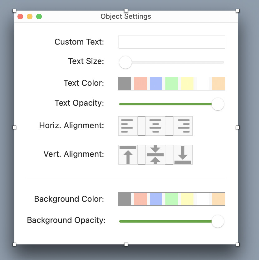 The controls for Text Color, Horizontal Alignment, Vertical Alignment, and Background Color are all containers that are embedded into this window. As you can see from the screenshot in the original post, on Windows, only the center and bottom vertical alignment buttons actually show up, out of these 4 containers.