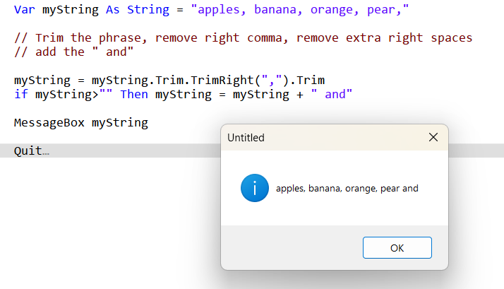 MyString = MyString + " And " + MyArray(xCount) + “.”