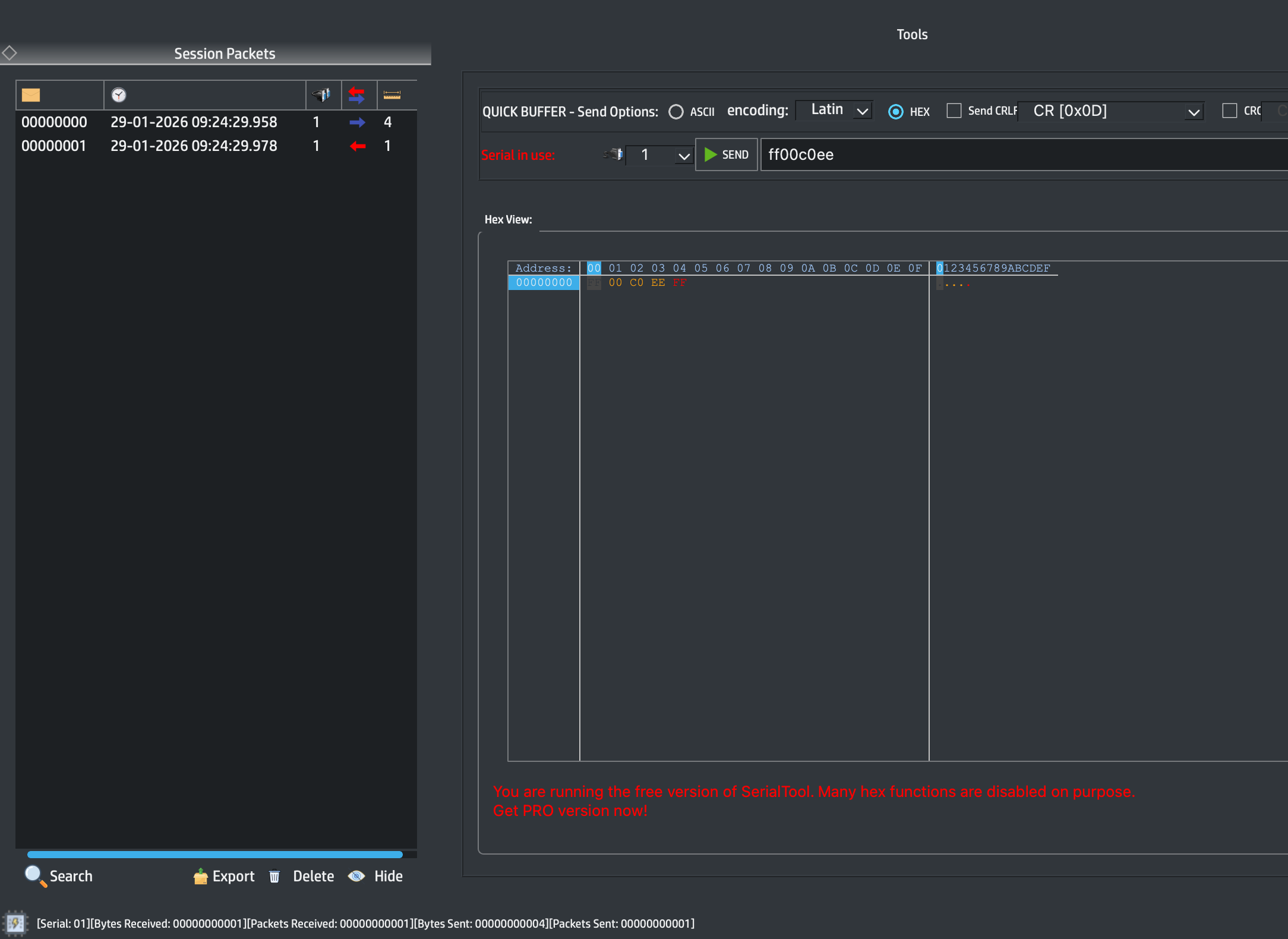 In SerialTools’ terminal, I send it the command ‘80h’ which is used to see if the router is alive. It should respond with ‘FFh’ but I get nothing back. When I send the command, the “Tx” light on the adapter flashes. The Rx light does not. The manual says there should be a reply within 1ms from the router to this command.