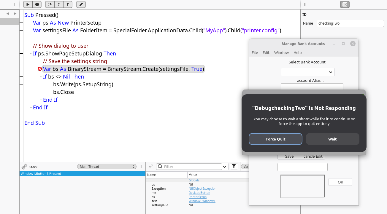 I am a newbie here and trying to create my first complete program. I am doing OK … but currently my hurtle is saving and reloading Printer setting. I copied the code from the Xojo manual. and could use some help . Is the manual wrong or am I doing something wrong?