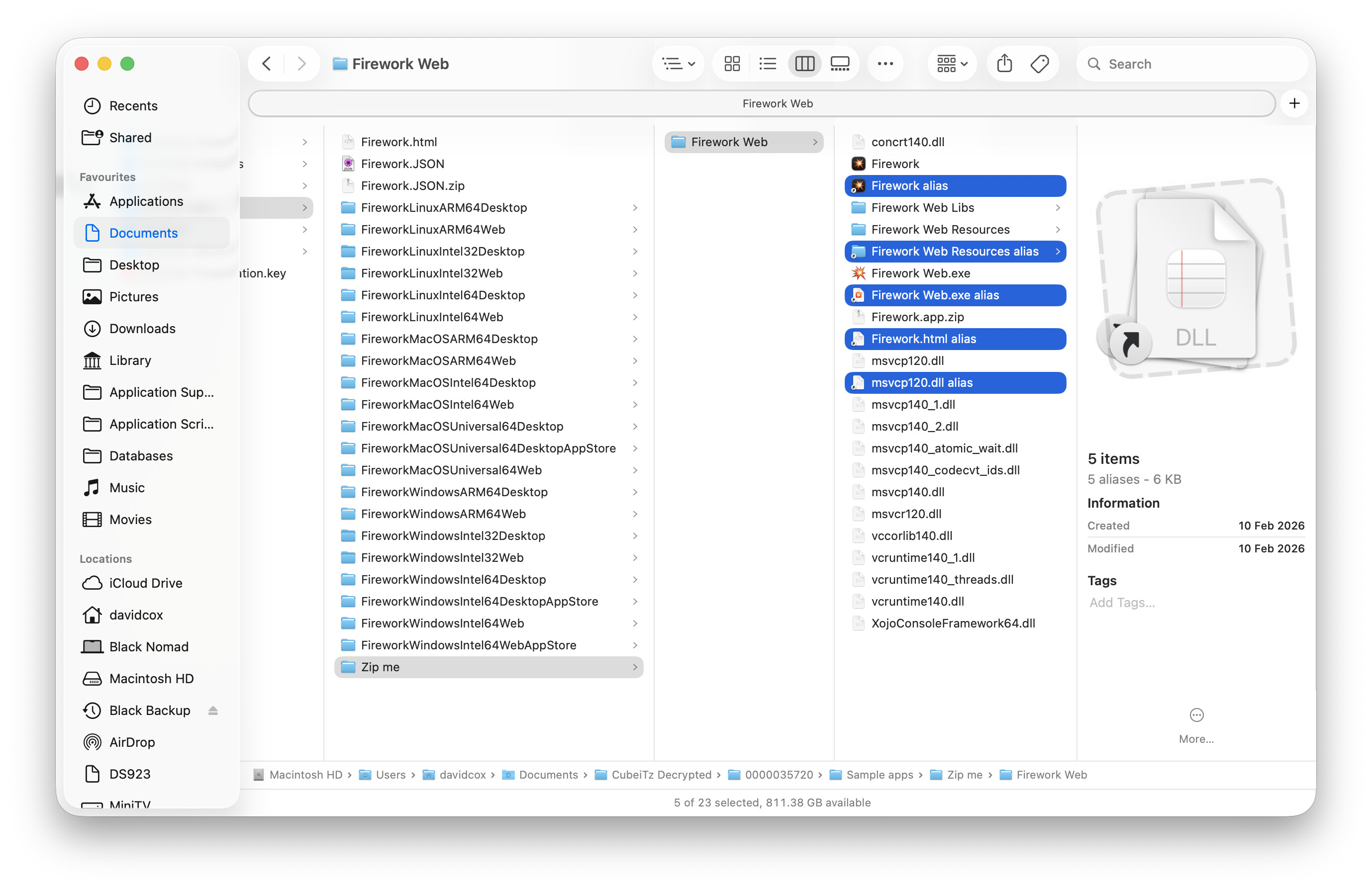 My source folders to Zip included a Windows Web app build with a few of the items with Alias counterparts, plus an alias to a file that was outside the main folder (Firework.html alias), plus a macOS App (Firework) and an Alias to this App):