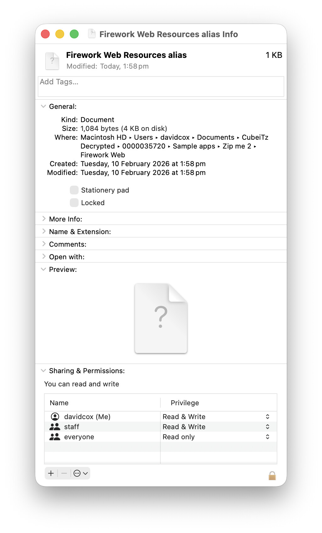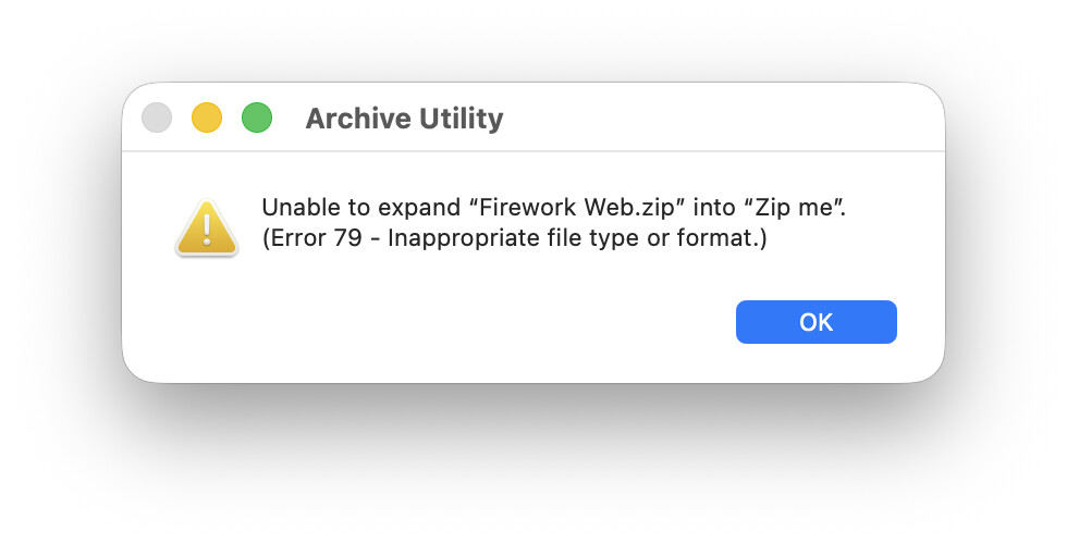- Compressing the ‘Zip me’ folder produces a zip file, but when you try to open the zip file in the Finder it gives an ‘Error 79 - inappropriate file type or format’ error. If you unzip via Xojo it unzips without complaint, but the file aliases are not working (see next line), yet the aliases within the macOS App ‘Frameworks’ package are working fine!
